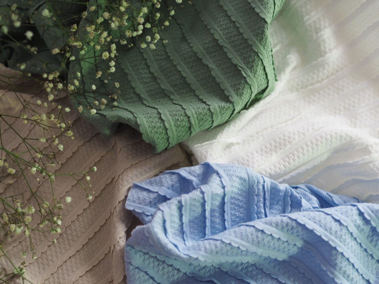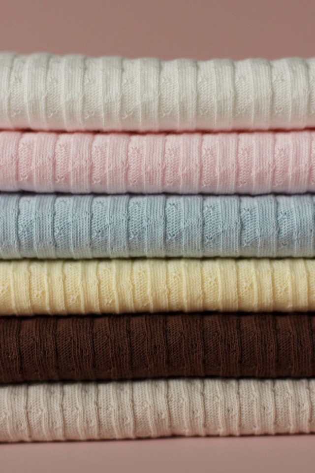 Все виды жаккардового трикотажного полотна, ажурная рибана, кулирка-рюши, ажурное кашкорсе, лапша (различный рапорт), интерлок-жаккард, вафля, даблфейс-интерлок