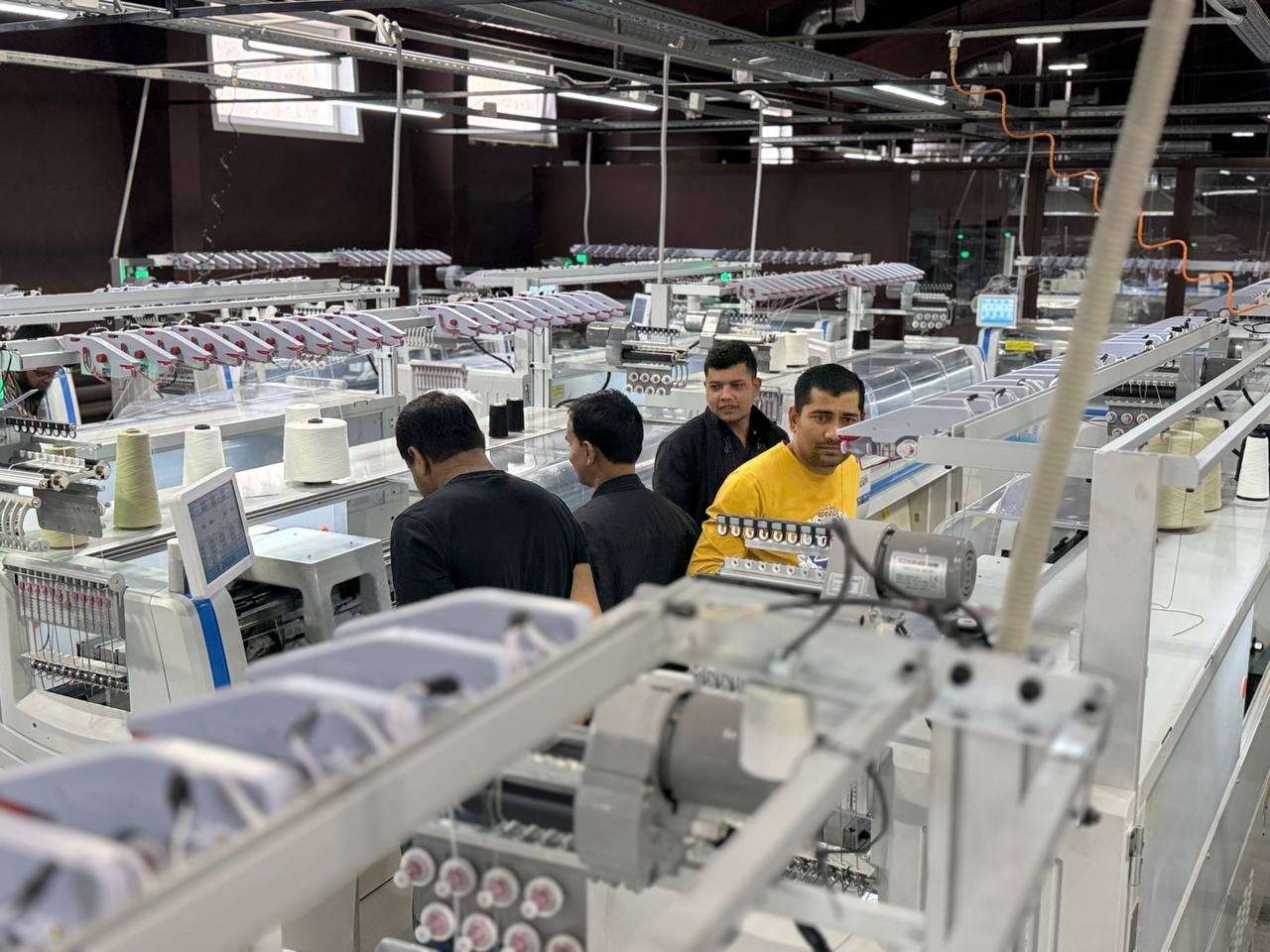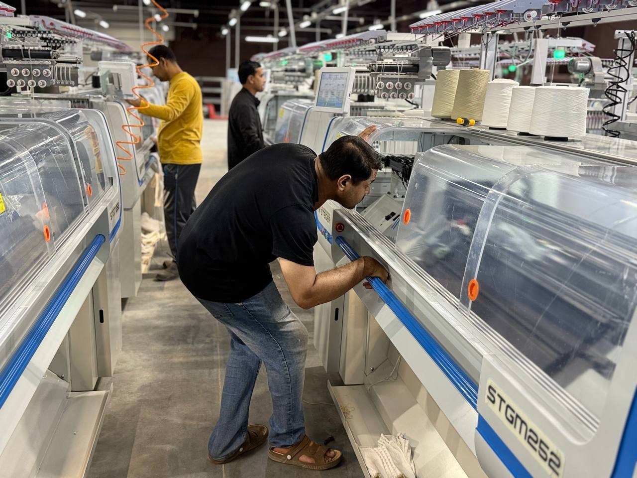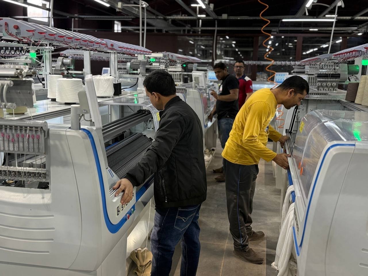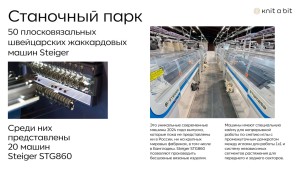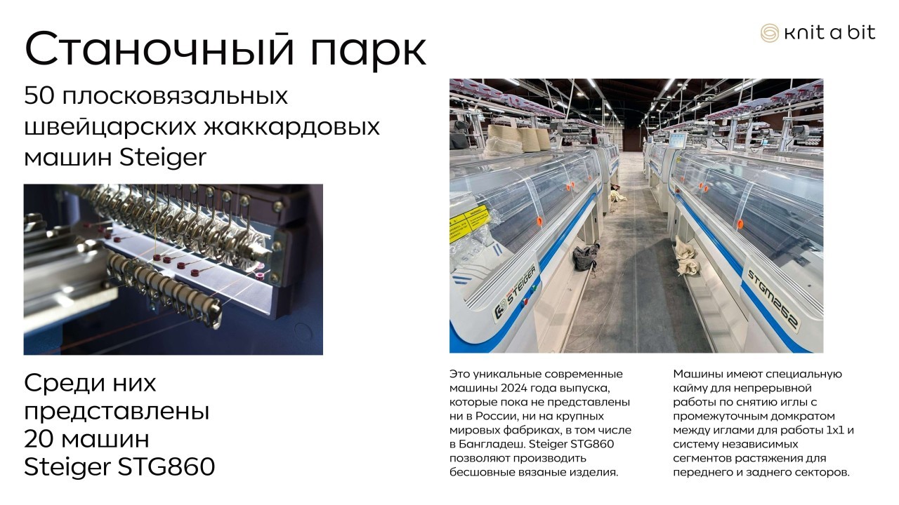 50 плосковязальных машин Steiger, из них 20 - кругловязальные машины STG860. 24 кеттельных машины, машина для перемотки пряжи. Возможность вязания от 5 до 14 класса, оборудование для цельновязанных изделий.